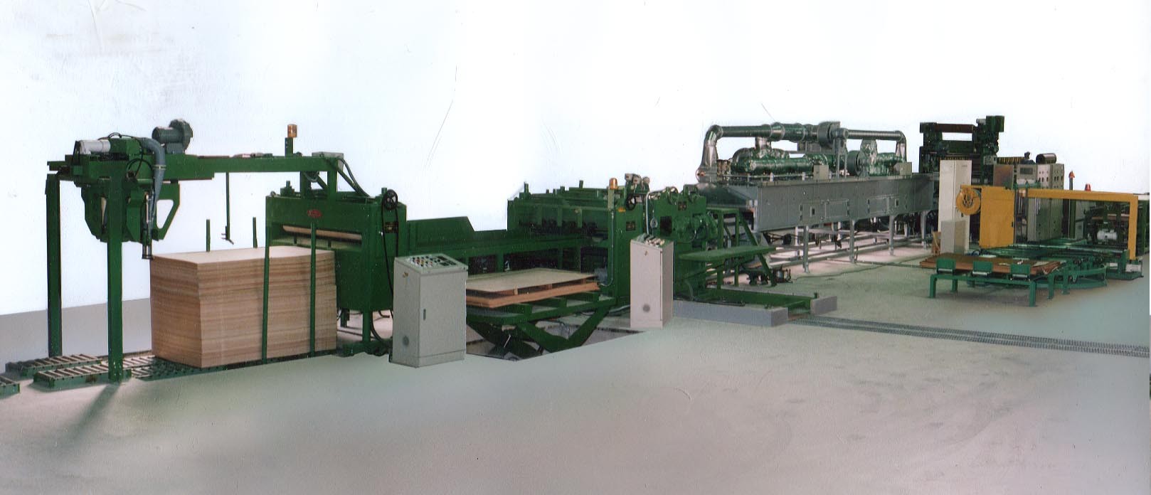 基材の投入+除塵+接着剤塗布+乾燥+化粧紙の貼付+カットを行うライン