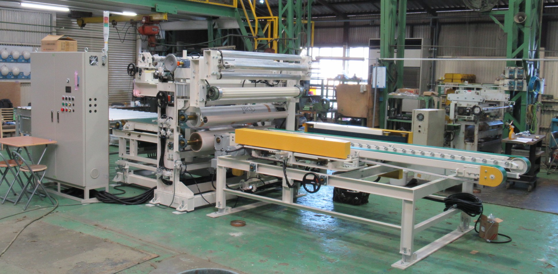 基材の投入+除塵+接着剤塗布+オレフィンの貼付+カット+枚葉プレスを行うライン